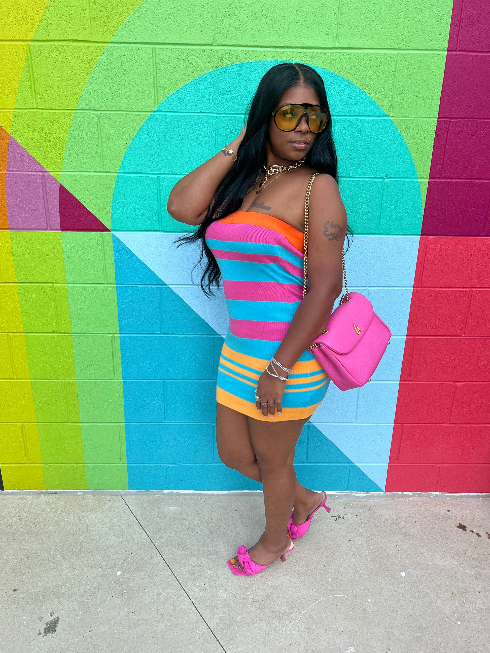 Our At Sunset Multi-Color Striped Strapless Mini Dress, Multi-Colored Striped Design, Bodycon Style,